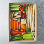 Selection of dips, batons of celery, carrot, cucumber, red & green pepper, cherry tomatoes and grissini