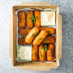 A delicious variety of vegan-friendly bite-size empanadas, pies, and arancini — perfectly portioned for hassle-free catering.